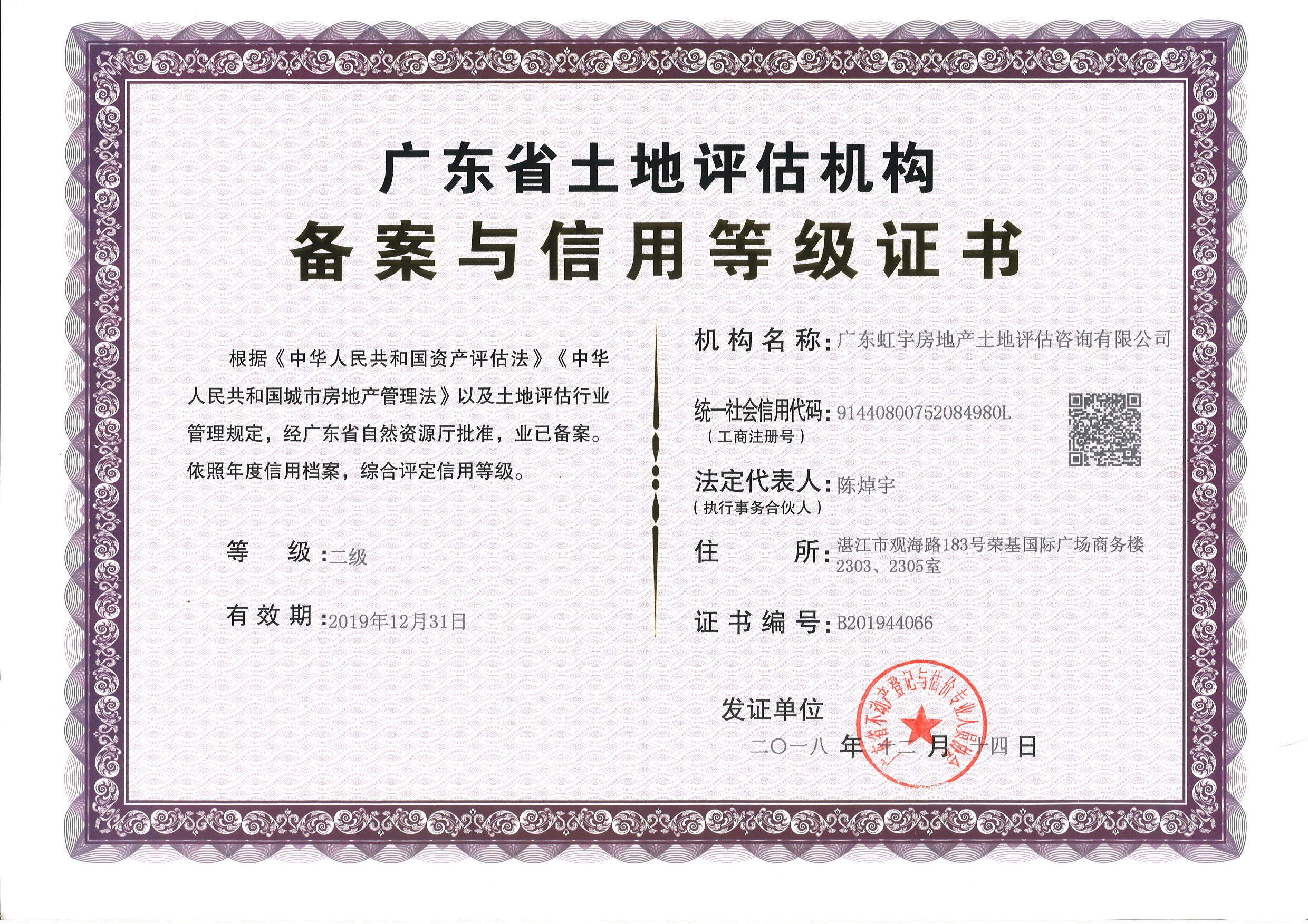 廣東省土地評(píng)估機(jī)構(gòu)備案與信用等級(jí)證書